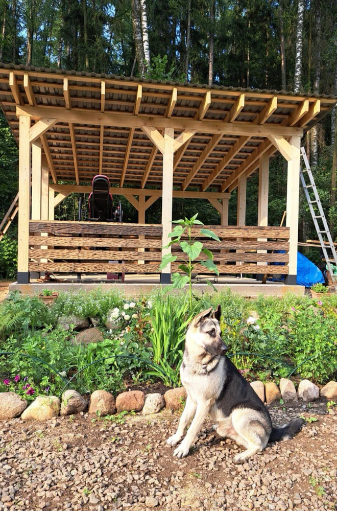 - Эстетика: Черное порошковое покрытие опор отлично сочетается со светлым деревом и темной кровлей, придавая строению законченный вид.